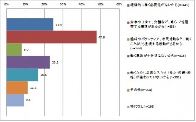 一都3県在住の35歳~55歳の(子どもなしもしくは小学生以上の子どもあり)女性で、以前にフルタイムでの就業経験はあるが、現在は働いていない女性1,794人に対して「現在働いていない理由」を聞いたところ、「家事や子育て、介護など、働くことを阻害する環境があるから」が最も多く47.8%を占めたが、「働く意欲が十分ではないから(23.2%)」、「働くために必要なスキル(能力・知識・資格)が備わっていない(16.8%)」などの、意欲やスキルの不足を挙げる回答も存在した。