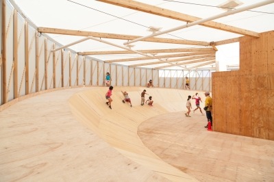 身体を使った遊びと、メディアテクノロジーを使った遊びを組み合わせて、まったく新しい遊びを楽しめる公園です。具体的には、不定形で起伏のある空間に、光や音などの「メディア」を使った仕掛けが埋め込まれています。あらかじめ決まった遊び方を習うのではなく、友達やプレイリーダーと一緒に、新しい動きや遊びのルールを生み出すことを触発するインスタレーションです。