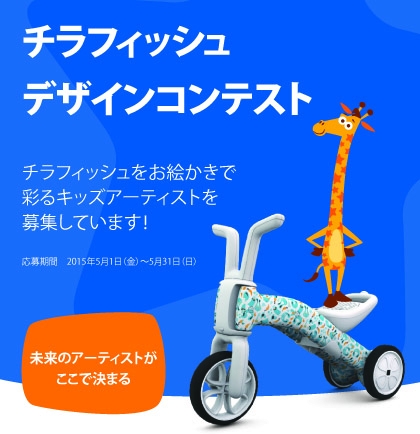 玩具とベビー用品の国内最大級の総合専門店である日本トイザらス株式会社(本社:神奈川県川崎市、以下:日本トイザらス)は、ベルギーの玩具メーカーChillafish(チラフィッシュ)社と共同で、キッズ向けバイク「チラフィッシュ」の新デザインを子どもたちから募集する「チラフィッシュデザインコンテスト」を実施いたします。2015年5月1日(金)から5月31日(日)まで、全国のトイザらス、ベビーザらス店舗又はキャンペーンサイト( http://www.chillafish.com/artistsoftomorrow )にて応募を受け付けし、グランプリに選ばれたデザインは、11月上旬よりチラフィッシュの新たなラインナップとして発売される予定です。