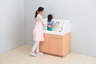限られた空間でも設置可能なコンパクトなのに広々使えるシンクバス。仰向けはもちろん、座っても立たせても、幅広い月齢に対応できる、お子さまと保育士のことを考えた、2才(24カ月)頃まで長く使える保育施設用のコンパクト沐浴ユニット。