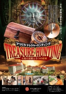 2014年4月に新メニューとしてアリビラスタッフが考案した「トレジャーハンティング」は、約1,000組(約3,500名)のお客さまが挑戦された、たいへん人気のメニューです。第1章の“羅針盤に秘められた謎”は5コースあり、全てクリアし【レジェンドハンター】の称号を得られたお客さまは4組でした。