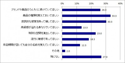 1 位は「商品の種類を覚えておいてほしい」33.3%。2 位は「庶民的な感覚を持って接してほしい」30.3%。逆に「高級感が溢れる身なりでいてほしい」13.3%などは低い結果に。