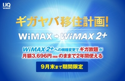 現在、WiMAX機器(WiMAX 2+非搭載)をご利用中のお客様は、2015年5月1日(金)から9月30日(水)までにWiMAX 2+対応機器へ機種変更いただくことで、WiMAX 2+が使い放題の「UQ Flat ツープラス ギガ放題」が、通常料金の月額4,380円ではなく、月額3,696円※3で2年間ご利用いただける、大変おトクな割引料金です。