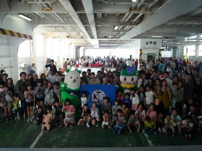 船内には、兵庫県香美町、大阪府堺市が地方創生を目的にした自治体観光PRブースを展開し、堺市のご当地ゆるキャラの「ザビエコくん」たちが参加者たちと触れ合い、なごやかな時間を過ごしました。