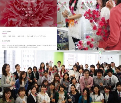 というアイデアを提唱。配布したカーネーションを手土産に、ママがハッピーになるような時間を過ごすようにと、全社員に促しました。
