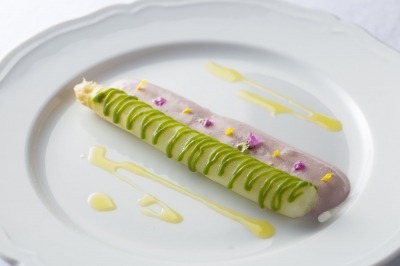 ホワイトアスパラガスのヴァポーレ 赤ワインヴィネガーのエスプーマとアサツキのピュレ