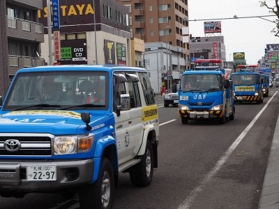 JAF札幌支部(支部長 横井 隆)は、5月11日(月)~20日(水)「春の全国交通安全運動」期間中の20日(水)「交通安全事故死ゼロを目指す日」に、交通安全啓発活動の一環として札幌市内約15kmのコースをレッカー車・サービスカー合計4台にて交通安全パレードを行いました。