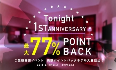 サービスの着実な成長拡大を歩んでこられたのも、アプリをご愛顧頂いているお客様あってのことと感謝しております。1周年を記念して、6月1日(月)~6月10日(水)の期間にて、高額ポイントバックとなるホテル大放出の感謝祭イベントを実施致します。既存会員様も、今回初めてTonightをご利用頂くお客様も、これを機に、是非Tonightで宿泊体験をして頂ければと思います!素敵なホテルタイムをお過ごしください。