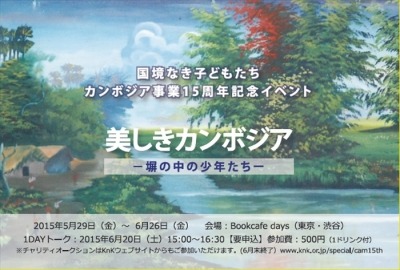 2015年は、KnKがカンボジアで支援事業を開始してから、15年の節目となります。これを記念し、日本国内にでも「美しきカンボジア-塀の中の少年たち-」と題して、東京・渋谷の「Bookcafe days」で、KnKが支援しているカンボジアの青少年が描いた絵の展示イベントと作品のチャリティオークションなどを行います。