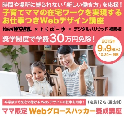 IT関連及びデジタルコンテンツの人材養成スクール、デジタルハリウッド福岡校は、Webのユーザー・インタフェース改善を簡単に実現する「Kaizen Platform」を運営するKaizen Platform, Inc.と、多種多様な雇用領域における人材採用に関する総合サービスを提供する株式会社リクルートジョブズからの協力をうけて、働く時間や場所に制約を持つ女性に対し、Webサイトの改善を担う高付加価値な職業「グロースハッカー」としてのキャリアアップを目指せる、子育てママの在宅ワークを実現する<お仕事つき>Webデザイン講座「ママ向けWebグロースハッカー養成講座」を提供します。
