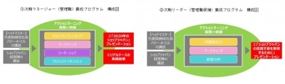 本プログラムは、次期マネージャー(管理職)養成プログラムと、次期リーダー(管理職候補)を対象に、知識の習得のみならず、取得した知識を実務に取り入れ、その結果、得られた気づきや学びをプログラムメンバー内で共有し、次のアクションに活かすまでを構成としています。