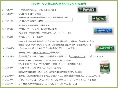 日本では大人が楽しむガムと言えば「板ガム」が全盛の1985年、クロレッツは世界で初めて、スティック型のパッケージと粒ガムの個包装を採用し、それまでの常識を覆す大人向けの「粒ガム」として日本で誕生。以来30年間、クロレッツは独自技術の開発・採用で「息スッキリ」を訴求し続けてきました。そこで、日本発売30周年を記念し、クロレッツの歴史を振り返りながら、ブランドを支え続けた技術力、そしてこれまで語られることのなかったブランド秘話を紹介します。