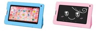 付属の専用カバーの色はクールなアクアブルーと可愛らしいミルキーピンクの2色で展開、カバーを折り畳むことで使いやすいタブレットスタンドにもなります。