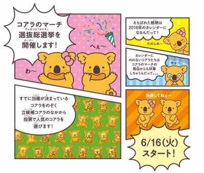コアラのマーチの500種類の絵柄のうち、ロッテが選定した「当確コアラ」をのぞく「立候補コアラ」の中から一般投票により人気のコアラを選抜し、2016年のカレンダーに使われるコアラを決定するキャンペーン。