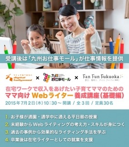 IT関連及びデジタルコンテンツの人材養成スクール、デジタルハリウッド福岡校は、株式会社西日本新聞メディアラボが運営する地域特化型クラウドソーシングサイト「九州お仕事モール」と、株式会社西日本新聞社が運営する女性向けWebメディア「Fan Fun Fukuoka」との共同事業として、『Webライター養成講座(基礎編)』を開講します。