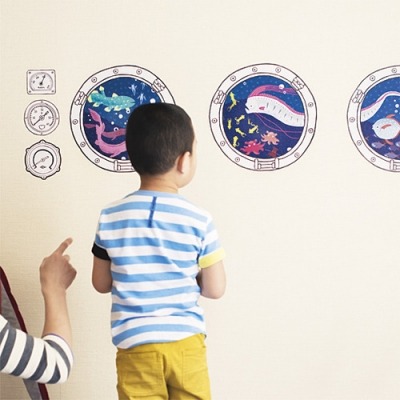 潜水艦の窓の向こうに深海魚の姿が!? 深海の世界をのぞいている気分になれるウォールシールはいかがですか? タコメーターも付いて、ますます潜水艦っぽいでしょ。つながる絵柄になっているから、集めて壁に等間隔に貼るのがおすすめ。