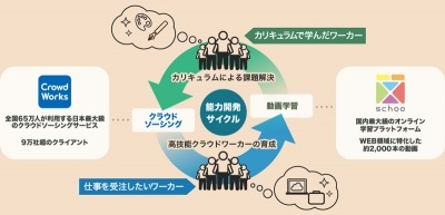 インターネット生放送を活用したコミュニケーション型動画学習サービス「schoo(スクー) WEB-campus」を運営する株式会社スクー(本社:東京都渋谷区、代表取締役:森健志郎、以下スクー)は、株式会社クラウドワークス(本社:東京都渋谷区、代表取締役社長:吉田浩一郎、以下クラウドワークス)と、双方のサービスでクラウドワーカーを育成する連携を発表。プロジェクトの第一弾として、クラウドワークスに所属する全65万人のクラウドワーカーを対象に、全14コマの特別カリキュラムを無料で提供する。