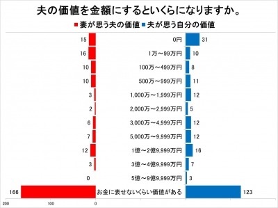 金額を選んだ中で多かったのは、妻が思う夫の価値「1万~99万円」「0円」「1億~2億9,999万円」、夫が思う自分の価値「0円」「1億~2億9,999万円」となり、意外だったのが、自分を0円と評価する人が多かったことです。