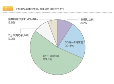 平均的な出社時間を聞いてみると、「朝残業」がはかどりそうな1時間以上前に来ている人は10%と少数派。