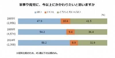 1.「家事・育児に今まで以上に関わりたい」と思う父親は 9 年間で増加した。 ●2005 年 47.9%、2009 年 54.2%、2014 年 58.2%