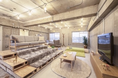 このデザインでは、元は3DKだった居室の壁を全て取り払い、フラットな空間にしています。また、床に設置された24個のパレットを組み合わせることで、室内を自由にレイアウトできることが特徴です。写真のように、パレットを積み上げ中心にソファを据えて、大勢でテレビ観賞を楽しめるスタジアム風の居室にしたり、ベッドを中心に置いて空の上で寝ている気持ちになれる空間をつくったりと、自由な発想で住空間を演出できます。