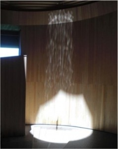 風室の真上は、融氷水盤と同じ直径2mの穴が開いており、太陽が高く昇る 夏至頃だけ光の模様の現象を楽しめます。太陽の位置が低い冬期は「陽室(ようしつ)」で太陽光を吸収する設計となっており冬は太陽の暖かさを感じることが できます。このように季節ごとの自然現象を取りいれた工夫が随所に施されています