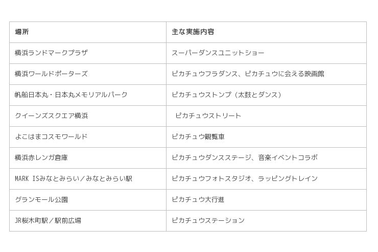 これと連動し、「ポケットモンスター」で大人気のピカチュウが横浜みなとみらいに大量発生して、来街者とともにダンスを楽しむ参加型イベント 「踊る?ピカチュウ大量発生チュウ!」を、(株)ポケモン・(株)ポケモンコミュニケーションズとのタイアップにより開催します