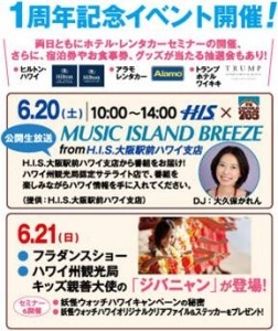 株式会社エイチ・アイ・エス(本社:東京都新宿区 代表取締役社長:平林 朗 以下H.I.S.) 関西営業本部では2015年6月20日(土)・21日(日)の2日間、H.I.S.大阪駅前ハワイ支店1周年イベントを開催いたします。
