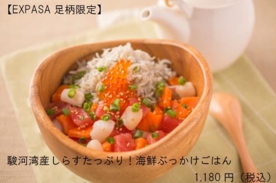 足柄限定メニューとして「駿河湾産しらすたっぷり!海鮮ぶっかけごはん」や季節限定の「アボカドサーモンごはん」を提供するとともに、お米・具材・むすび加減にこだわった「おむすび」、お供にピッタリの「いわしのつみれ汁」なども取り揃えています。
