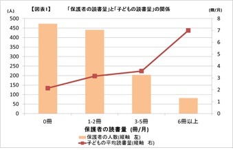 今回の調査では、保護者の読書量についても調べました。その結果、親の読書量と子どもの読書量との間には相関性があることが分かりました。保護者の1か月の読書量によって0冊、1~2冊、3~5冊、6冊以上、の4つのグループに分類し、各グループに属する子どもの読書量を調べてみた結果が【図表1】です。例えば、本をまったく読まない親の子どもの1か月の読書量が平均2.1冊であったの対して、本を1か月に6冊以上読む親の子どもの読書量は平均6.9冊でした。この結果から、親が本をよく読む家庭では、子どもも本をよく読む傾向にある、と言えます。