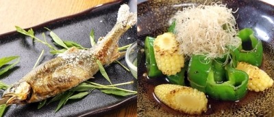 鮎に鱧、水茄子、枝豆、トマト、ヤングコーン、甘長唐辛子、ズッキーニ・・・
