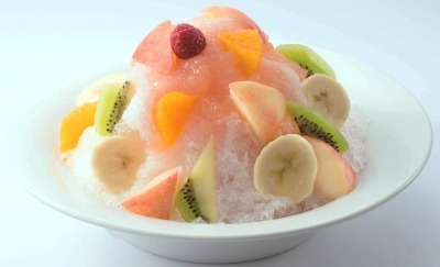 ふわふわ食感と繊細なくちどけが特徴の「純氷かき氷」。山盛りのかき氷に、香り豊かなピーチシロップと練乳入りシロップをたっぷりとかけ、桃、キウイ、オレンジ、バナナなどフルーツをふんだんに盛り合わせた豪華なかき氷です。