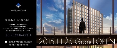 (株)マイステイズ・ホテル・マネジメント(本社港区、代表取締役社長 麻野篤毅)は、展開する3ブランド(ホテルマイステイズ、フレックステイイン、マンスリーレジステイズ)に加え、2015年11月25日のグランドオープンに先駆け、2015年8月24日に「ホテルマイステイズ五反田駅前」をソフトオープンいたします。JR山手線五反田駅からわずか30秒。国内外へと通じる羽田空港には2駅先の品川駅から約5分、国内移動が便利な東京駅へは16分と、東京を行き来するお客様により便利なホテルです。