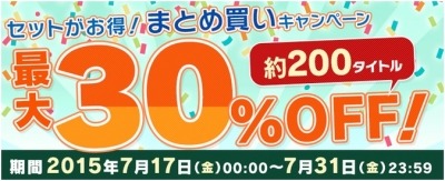 株式会社ブックウォーカー(本社:東京都千代田区 代表取締役社長:安本洋一)は、2015年7月17日(金)より電子書籍ストア「BOOK☆WALKER」にて配信中の約200タイトルの作品がセットで最大30%OFFになる「セットがお得!まとめ買いキャンペーン」を開催いたします。