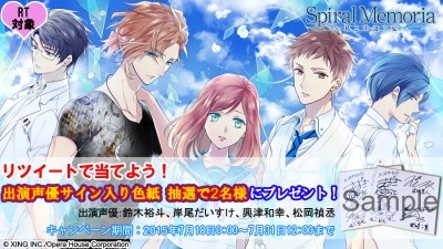 アニメやゲームなど幅広く活躍する人気声優、鈴木裕斗さん、岸尾だいすけさん、興津和幸さん、松岡禎丞さんを起用した女性向けフルボイス恋愛アドベンチャーゲーム『Spiral Memoria~私と出逢う夏~』のリリースを記念して、出演声優全員のサイン入り色紙が当たるキャンペーンを開催します。
