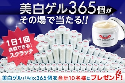 今回は夏の特大プレゼントとして美白オールインワンゲル『アクアコラーゲンゲル美白』(10g)の365個セットが10名様に当たります!!