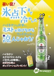 Doc popcorn原宿店のウッドデッキで、冷たいミストを浴びながらキンキンに冷えたハイネケンエクストラコールド(¥600(税込))を販売いたします。
