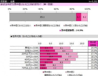 ●『熱中症経験者』14.9%。 若い年代ほど熱中症対策せず