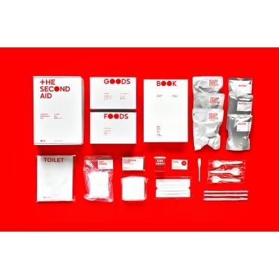 A4サイズの箱に、「BOOK」と書かれた本と、「GOODS」、「FOODS」と書かれた小箱2個が入っています。「BOOK」は、携帯・ネットが繋がらない災害発生時の生きる知恵がつまったマニュアル。「GOODS」には、断水中に使えるトイレや身体を拭ける無菌濡れタオル等の震災の経験から開発されたグッズを、「FOODS」には、そのまま食べられる非常食(さつまいもの甘煮)と水がセットされています。箱の表に貼ることで消費期限がすぐにわかる西暦シール付き。本商品は、仙台で東日本大震災を経験した高進商事と横浜のデザイン事務所のコラボで誕生しました。
