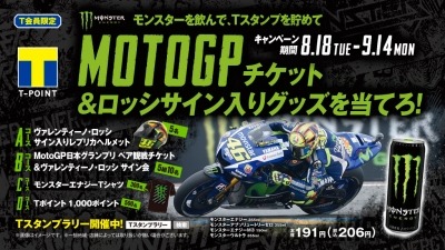 モンスターエナジーとファミリーマートは、8月18日(火)~9月14日(月)の期間、全国のファミリーマートで、MotoGP日本グランプリの観戦ペアチケット等が当たる「MOTO GPチケット&ロッシサイン入りグッズを当てろ!」キャンペーンを実施します。