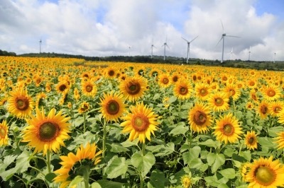 雄大な空の下、高原の風を受けてゆっくり回る風車に、一面のひまわり畑が広がる景観は、まさに息をのむ美しさです。この機会に布引風の高原へ是非お越しください。