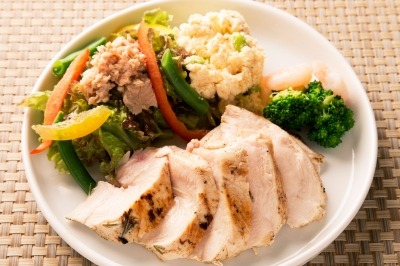 主菜はチキンのロティ。鶏むね肉にローズマリーで香り付けし、オリーブオイルでじっくり煮込み、しっとりとした食感にし、食べ応えある200g盛りました。副菜にはたっぷりのサラダとポテサラ風のおからのサラダ、ブロッコリーと海老のイタリアンソテーを添えて食感も楽しめるように工夫しました。ボリュームたっぷりでも低糖質な一皿に仕上がりました。