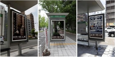 8月24日(月)より2週間、巨人がそれぞれのバス停付近に現れた場面を描いた34種のポスターを大阪市内バス停33ヶ所に掲出致します。一部のポスターでは、ある角度から見ると、まるでその場に巨人が出現しているかのように見える仕掛けが施されています。
