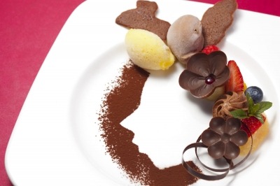 デザートには、華やかな髪飾りをつけている女性の横顔を、白いお皿に描いた逸品。オレンジソルベやショコラアイス、フルーツで髪飾りを表現しました。チョコレートでつくった花飾りやイヤリングがポイントです。