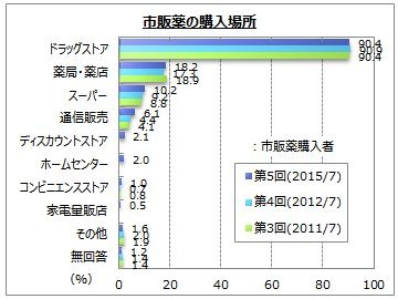 ■市販薬の購入場所は「ドラッグストア」が9割、「薬局・薬店」「スーパー」が1~2割。今後の購入意向は「ドラッグストア」が6割強、「スーパー」「薬局・薬店」「通信販売」「コンビニエンスストア」が続く