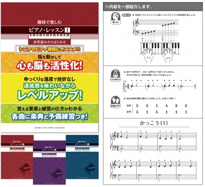 “入会資格60歳以上・初心者”のピアノ教室を主宰する 元吉ひろみ先生 の数々のレッスン事例をもとにカリキュラムを構成し作られた、新定番のシニアのためのピアノ導入教本ができました。「リズム練習」、「指動かし」から始め、曲になじんだ後にピアノに向き合えるので、ゆっくりとした進度で達成感を味わいながらレベルアップができます。曲は複数のレベルでアレンジを用意していますので、ソロでも、アンサンブルでも、各人の進度を気にせずに使用ができます。また、各曲に楽典と予備練習が付いていますので、はじめての方でも安心してピアノに取り組めます。大人が弾きたいクラシックや、よく知られた曲を収載し、3巻では「エリーゼのために」が弾けるようになります。9月には、教本と完全リンクした『併用ワークブック(1)~(3)』も発売予定。
