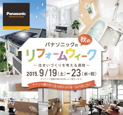 パナソニック株式会社 エコソリューションズ社は、全国各地のパナソニック リビング ショウルームにおいて、2015年9月19日(土)から9月23日(水・祝)の期間中、「秋のリフォームウィーク~住まいづくりを考える週間~」を開催します。