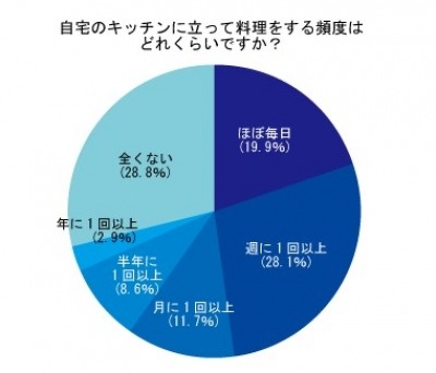 はじめに、「自宅のキッチンに立って料理をする頻度はどれくらいですか?」という質問をした。結果、「ほぼ毎日」と回答した人が19.9%、「週に1回以上」が28.1%、「月に1回以上」が11.7%、「半年に1回以上」が8.6%、「年に1回以上」が2.9%、「全くない」が28.8%だった。約半数の既婚男性が、週に1回以上、自宅のキッチンで料理をしていることが分かった。
