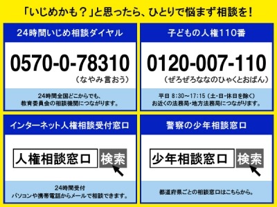 いじめを「しない」「させない」「見逃さない」!ここにもあります、相談窓口