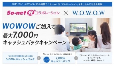 本キャンペーンでは、「So-net 光 コラボレーション」申込後にSo-netから送るメール記載の方法により「WOWOW」に新規加入し条件を満たすと5,000円をキャッシュバックします。さらに光回線を利用したテレビ視聴サービス「So-net 光 コラボテレビ」も併せて利用される方に、追加で2,000円をキャッシュバックします。